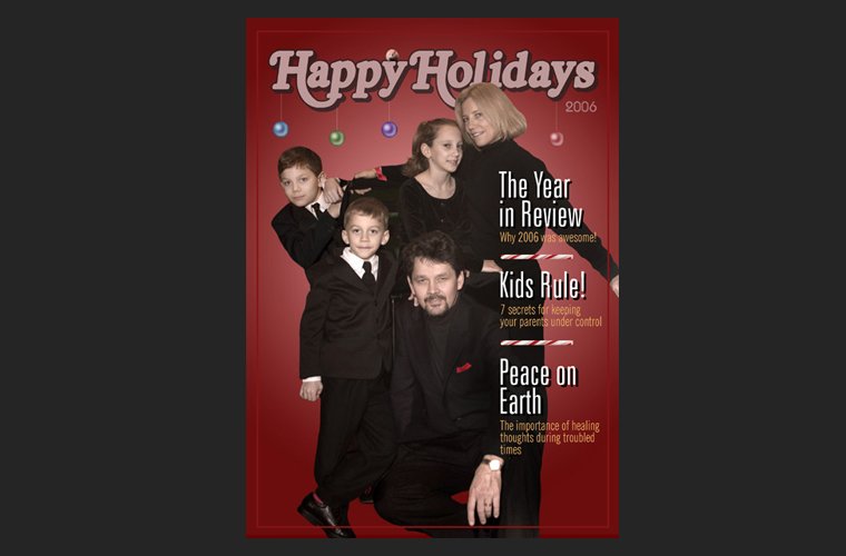 The idea for this card was to do a mock version of a Rolling Stone cover. It was intended to be fun, yet still reflect the spirit of the season. I shot a variety of family portraits before settling on this image. Once I had the photo, I edited it into the final format and then created the cover elements to complete the vision. (Click on image to see the complete chronology of cards.)