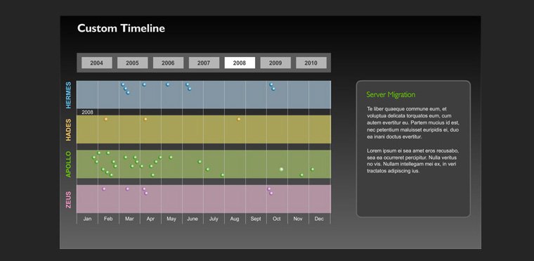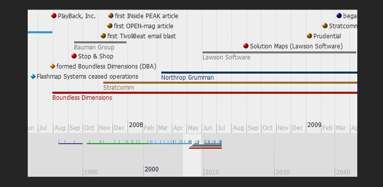 The notion of tracking information based on time has always fascinated me because it's such an obvious characteristic of how we think about things that have happened. This example is a timeline I built to depict events that have taken place in my work history. The timeline itself is an open source project called Simile that was developed at MIT.