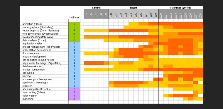 A while back I jottend down a list of what I considered to be some of my marketable skills so that I could do a quick assessment. After coming up with the initial list I started to rank the items in order of proficiency. Then I added a timeline for each skill so that I could track not only how much experience I have but also in what time period these skills were developed. And then to finish it off I color coded the timelines so that it would show the intensity of the skill in practice at any given point in time. Voila! What started as a simple list transformed into a rather interesting multi-dimensional visualization.