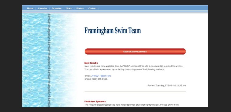 This one goes way back. Our kids were on the local town swim team and there was no website, so I built one. We recorded meet results into a database so that everyone on the team could go to the site and see their times for any given event. Pretty cool if I do say so myself! This was my introduction to building websites with dynamic content.