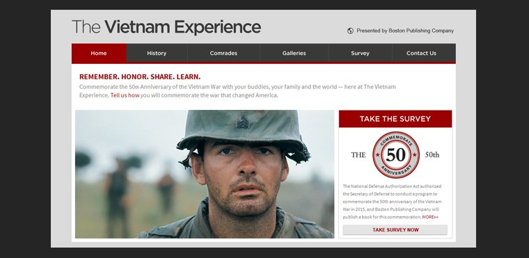 To commemorate the 50th Anniversay of the Vietnam War, I was asked to rebuild The Vietnam Experience website. One of the primary goals for the new design was to invite people to become involved in preparing for the anniversary event by taking a survey, sharing memories relating to the war and offering feedback. It was also constructed to be extensible, where additional content and features could be built out in phases.